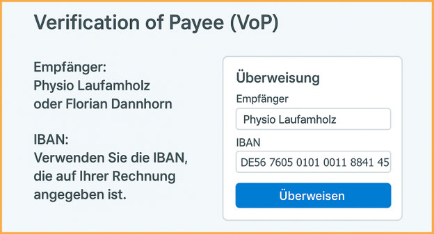 Seit dem 5. Oktober 2025 wird bei Banküberweisungen das Verfahren „Verification of Payee (VoP)“ angewendet. Dieses System prüft, ob der angegebene Name des Empfängers mit dem zugehörigen